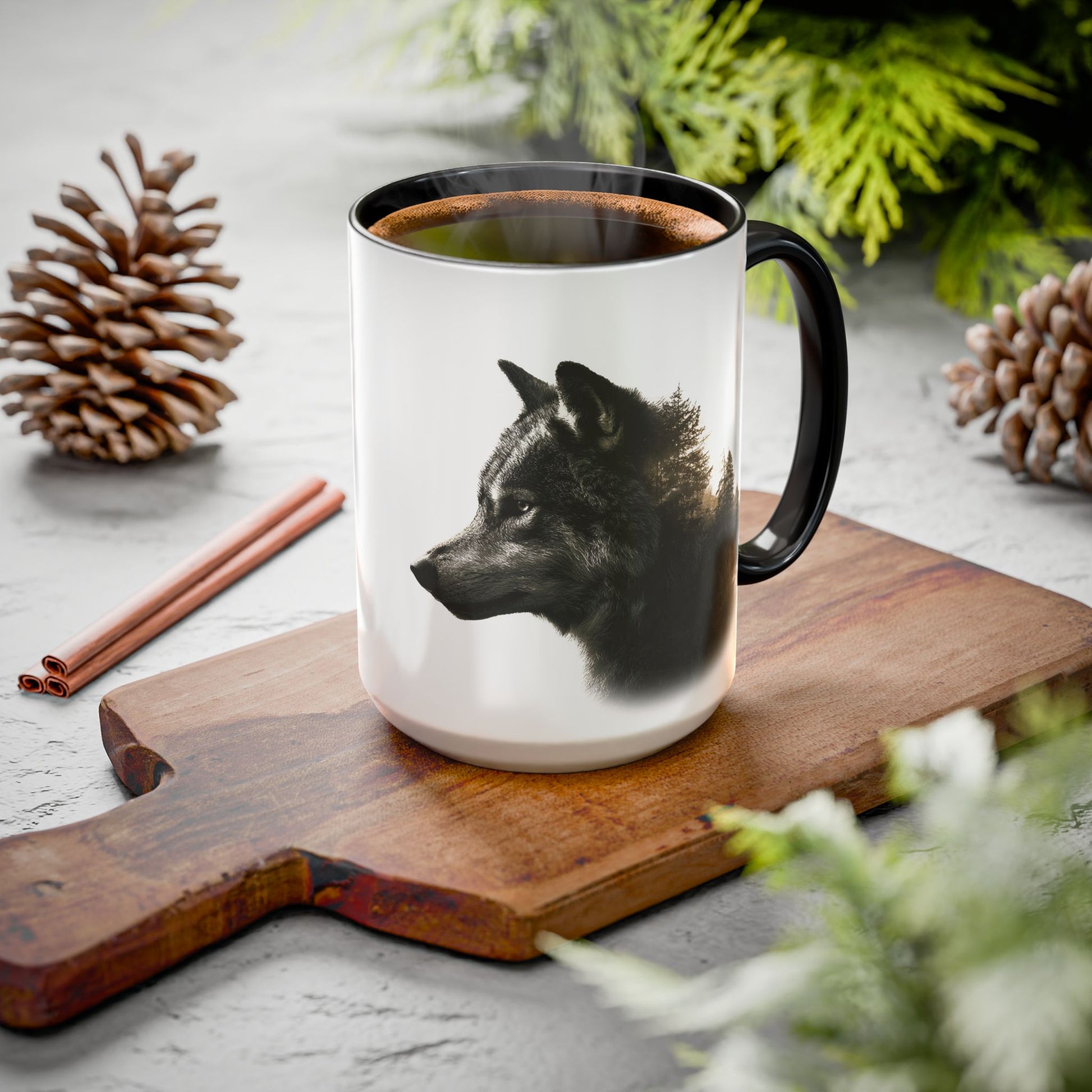 A White Ceramic Accent Color Mug with cinematic design featuring a bold grey wolf portrait, with bold, modern style — perfect for nature lovers, creators, and anyone who loves expressive artwork. A striking ceramic mug that blends wild spirit with quiet mornings. The artwork—two mirrored wolf profiles and a single side portrait—feels like a breath of forest at dawn, dark fur dissolving into silhouette trees. Bright, durable printing holds every soft brush stroke and contrast, while the colored interior and handle add a pop that frames the illustration. Comfortable to hold and built to last, this mug carries calm, focus, and a touch of wilderness into everyday routines—whether it’s coffee before a hike or tea during a late-night sketch session.